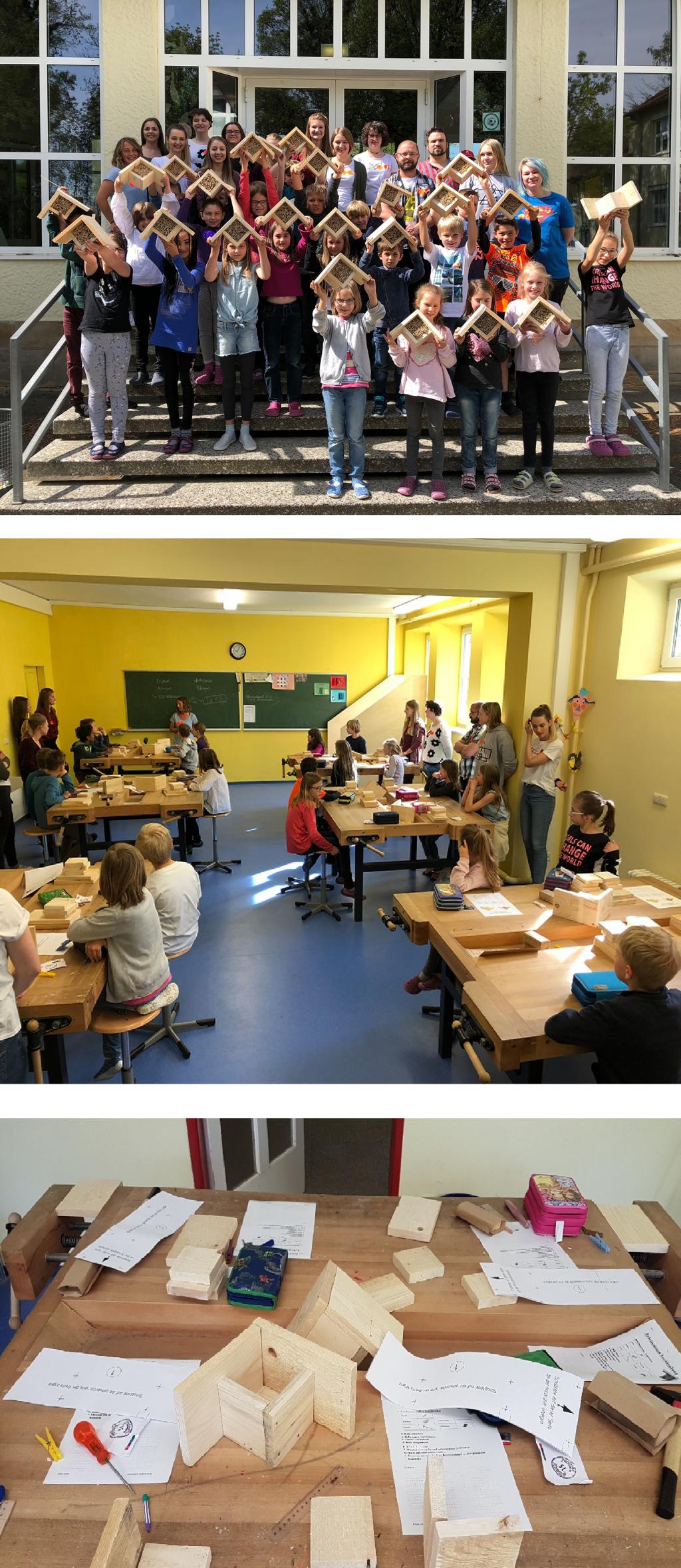 Am Schluss des Projekttages präsentierte jeder Schüler der Lerchenbühl-Grundschule stolz seine selbst hergestellte Nisthilfe. Ein gewinnbringendes Projekt, bei dem sowohl die Grundschüler als auch unsere Studierenden neue Erfahrungen im handwerklichen als auch pädagogischen Arbeiten miteinander sammelten.