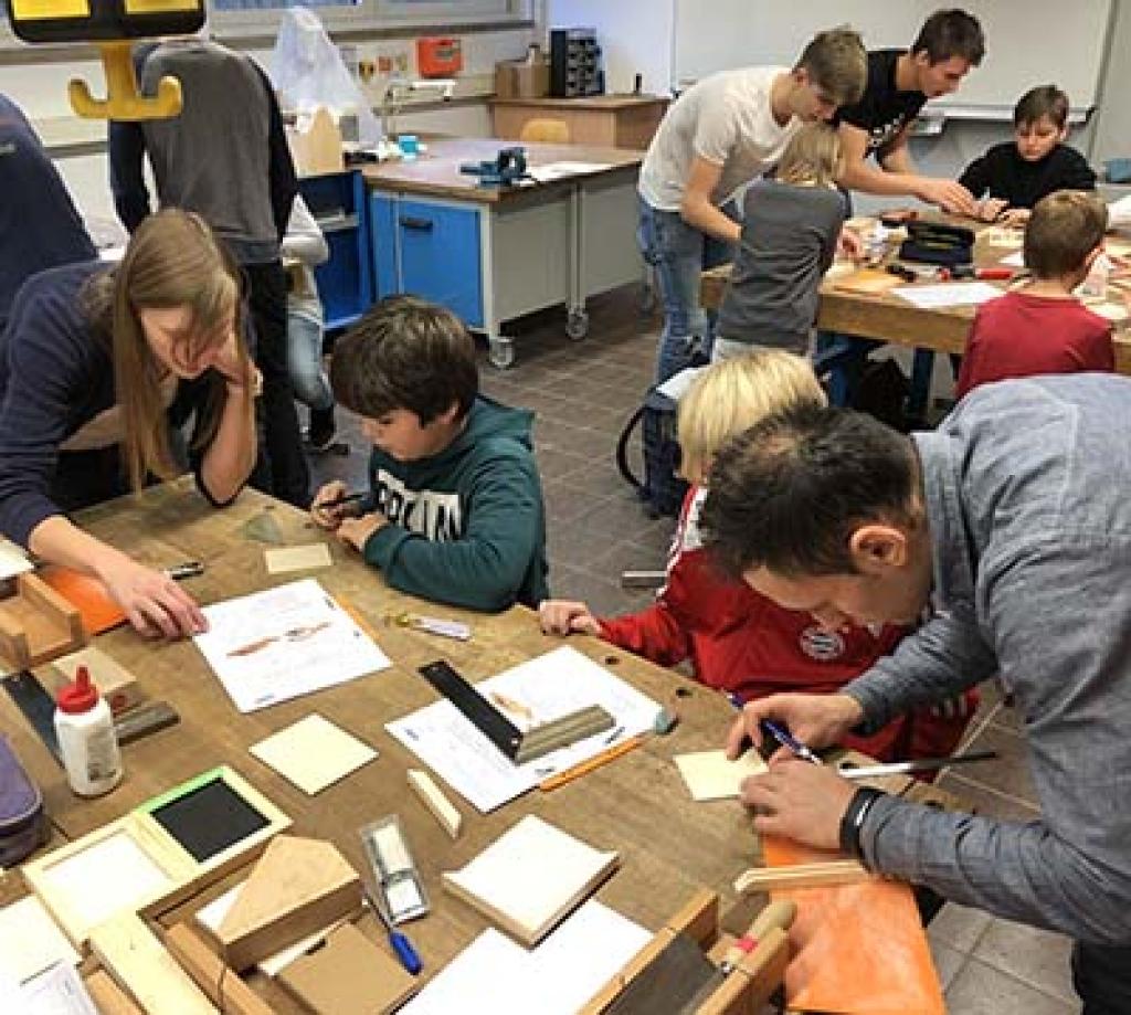 Das Werkmaterial, die Arbeitsblätter und didaktischen Hilfen für das Werkstück "Kreuzbrecher" hatten unsere Studierende für die 43 Schüler professionell vorbereitet. So gelang auch der Bau des einfachen Legespiels mühelos und alle Schüler fuhren nach drei Stunden intensiven Schaffens mit ihrem kleinen Weihnachtsgeschenk zufrieden nach Hause.