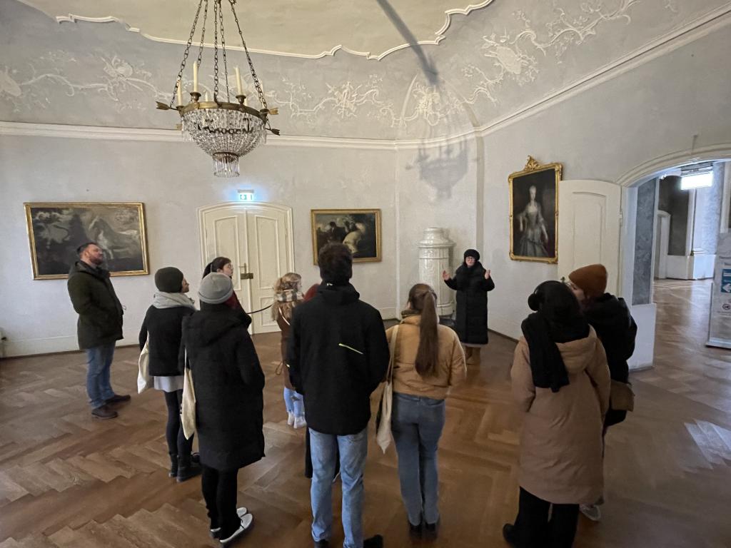 Am 10.02.2023 begab sich der Fachbereich Kunst der zweiten Jahrgangsstufe im Rahmen einer Kunstexkursion auf die Spuren des Barock und Rokoko in das neue Schloss Bayreuth. Unter der Organisation und Leitung von Herrn Waßmann wurden die beiden Kunstklassen am Morgen im neuen Schloss von der Museumspädagogin Frau Weiss (Schloss- und Gartenverwaltung Bayreuth-Eremitage) in Empfang genommen und im Anschluss von Ihr durch den barocken Prunkbau geführt. Frau Weiss konnte uns hier durch ihr enormes Fachwissen nicht nur die Geschichte des Schlosses, sowie die gesellschaftlichen und familiären Zusammenhänge des Markgrafenpaars Wilhelmine&Friedrich detailliert erläutern, sondern durch ihre Funktion als Pädagogin auch Einblicke in die Methodik und Didaktik der Kunstgeschichtslehre geben. Doch damit nicht genug, im Anschluss bekamen wir auch noch die Gelegenheit, durch das italienische Schlösschen geführt zu werden, welches 1759 für die zweite Frau des Markgrafen Friedrichs, Sophie Karoline von Braunschweig- Wolfenbüttel, errichtet wurde. Hier endete dann auch ein absolut gewinnbringender und hochinformativer Kunstausflug, welcher ausnahmslos Zustimmung empfing.
