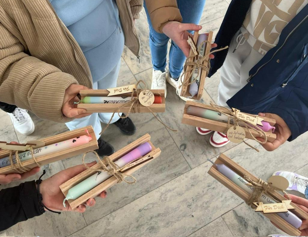 Workshop für die Schülerinnen und Schüler am IFL. Die Studierenden im ersten Ausbildungsjahr bereiten mit großem Engagement einen Workshop für 6. Klassen der Albert-Schweitzer-Schule in Bayreuth vor. Die Schülerinnen und Schüler gestalten kunstvoll eine Stabkerze, für die sie in den Werkräumen eine Holzbox herstellen. Über die liebevoll individuell verzierten und kreativ verpackten Geschenke darf sich ein Lieblingsmensch freuen.