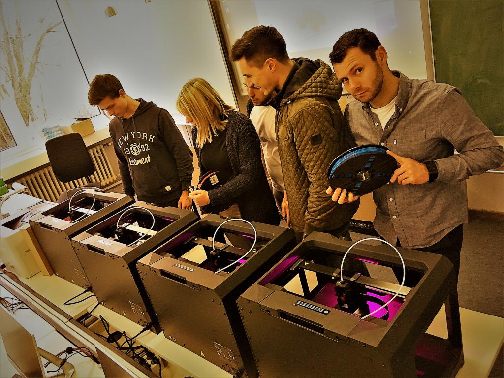 Nachdem letzte Woche einige schwere Pakete am IFL eingetroffen sind war es heute soweit: Eine 3D-Druck Expertengruppe führte das unboxing der MakerBot Replicatoren durch und druckte im Rahmen der CAD/TZ Fachdidaktik-Wahlpflicht gleich die ersten Sätze von didaktischen Modellen zur Darstellenden Geometrie aus! Nicht mit im Bild ist Herr Richter, der währenddessen schon mal nach bezahlbarem Filament forschte!